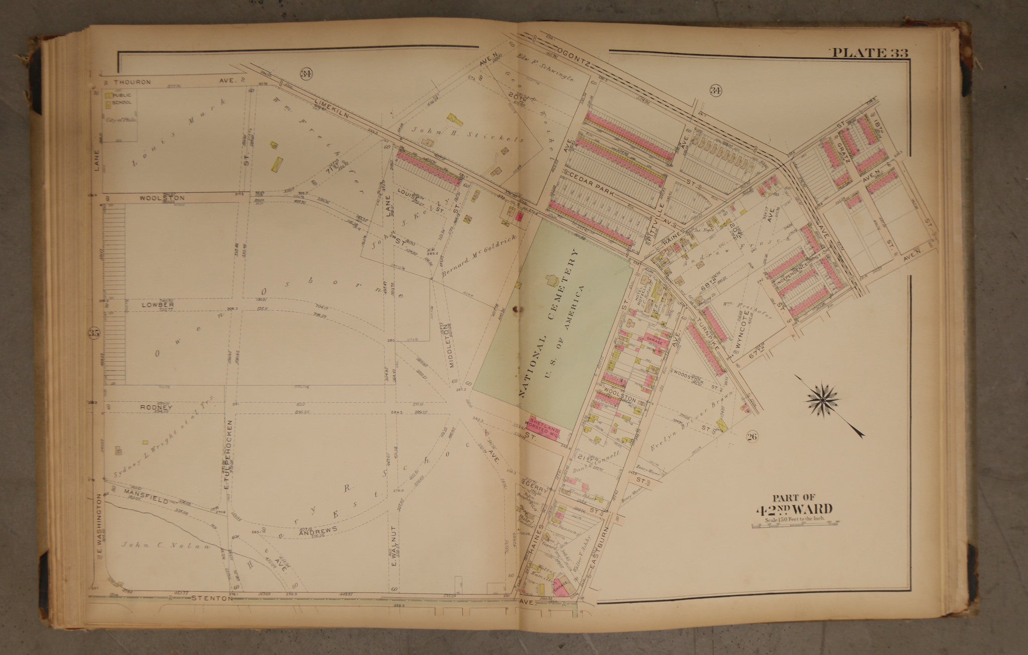 Big, beautiful and original! 23 by 33 linen map of the 42nd Ward from Ogontz Avenue to Stenton Avenue. This map features the Philadelphia National Cemetery (then called the National Cemetery of the U.S. of America). It shows the differences that can pop up between what is planned, and what comes to into fruition, with various roads that never popped up!