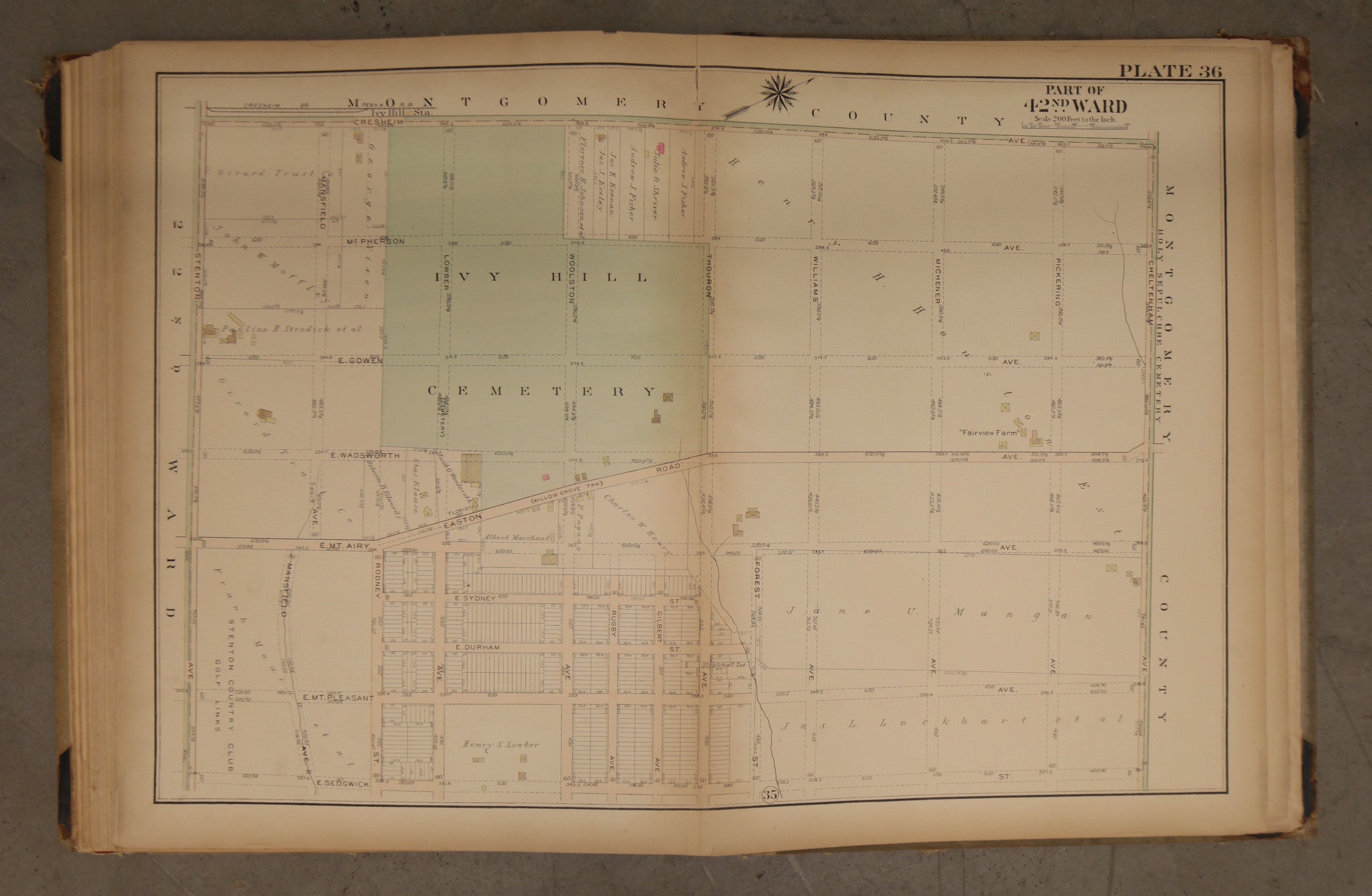 Big, beautiful and original! 23 by 33 linen map of the 42nd Ward between Cresheim Avenue (now Ivy Hill Road) and East Sedgwick Street, and Stenton Avenue and Cheltenham Avenue. This map shows Ivy Hill Cemetery and its full extent. It also shows the now-gone Ivy Hill Station and a farm known as "Fairview Farm" which has been lost to history.