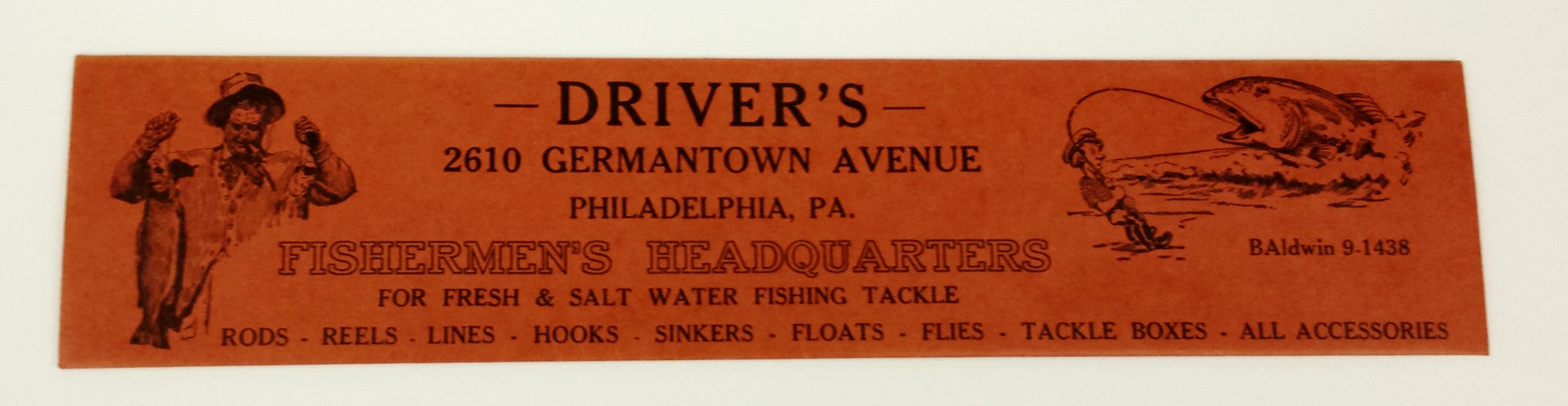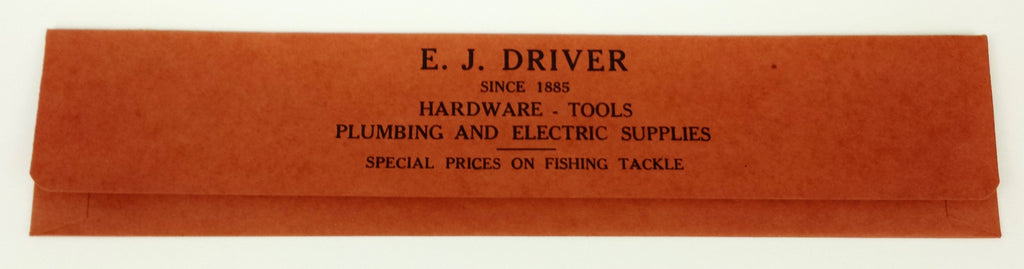 These envelopes from the "Fisherman's Headquarters" were probably meant to used for leaders with hooks. E.J. Driver's was located in Fairhill at 2610 Germantown Avenue in Fairhill. It opened in 1885--probably at a different location--and stocked a combination of seasonal goods (such as this envelope) in addition to regular tools and housing supplies. Envelope measure 3.5' x 15'