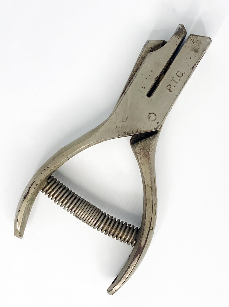 Heavy duty Philadelphia Transit Company ticket punch and studded leather carry pouch or holster ca. 1950s. "P.T.C" is engraved on the side of the punch. The tool would have been used by the conductor/driver on PTC trolley and bus routes. 3/16 round shaped Die. Punch tool measures 4.75" overall.
